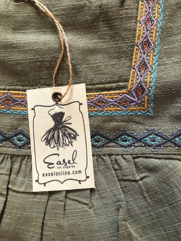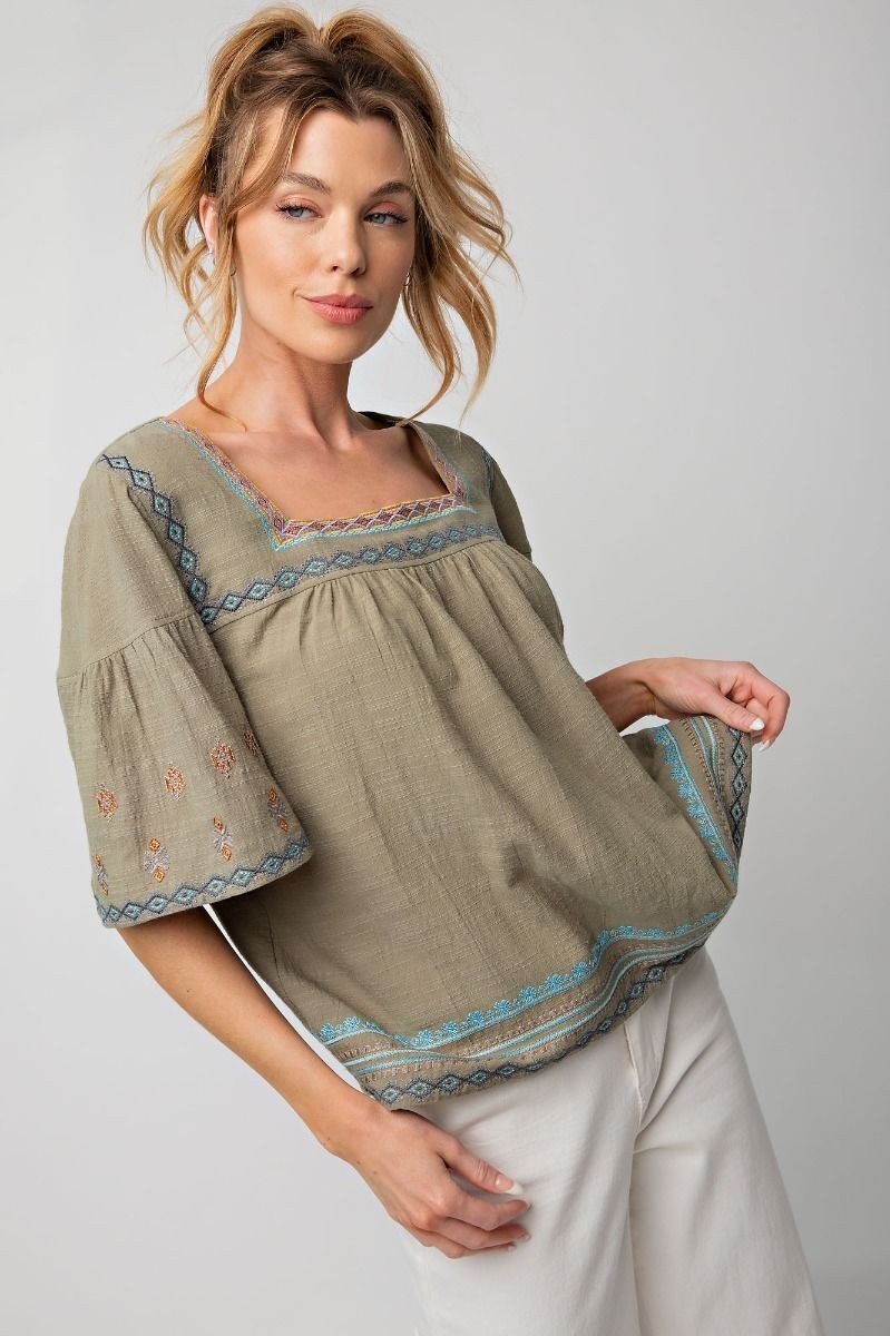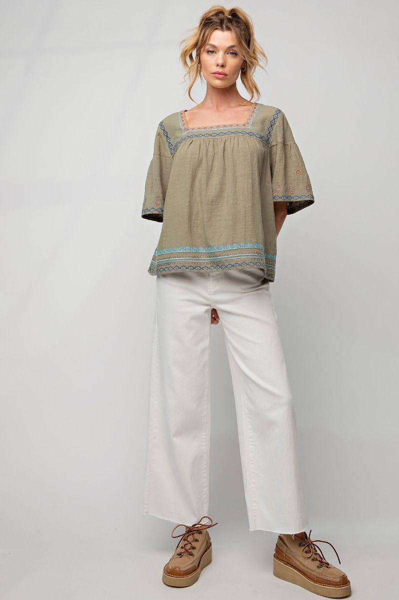 Easel Clothing Embroidered Square Neckline Sage Top Women's