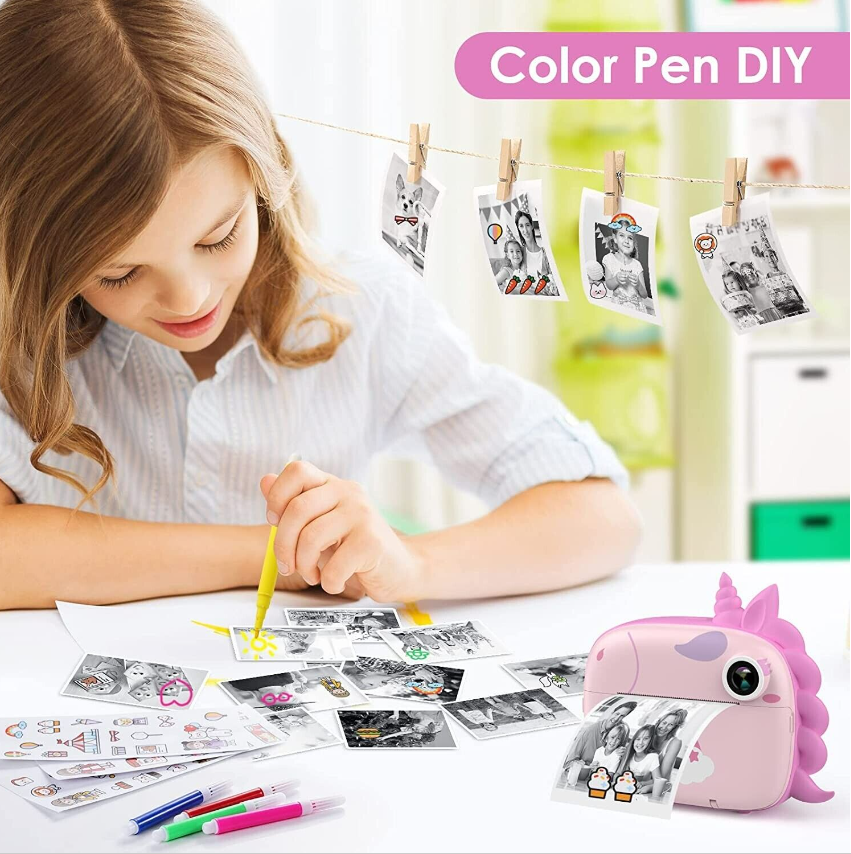• [BEST DIY CAMERA GIFT FOR KIDS] This kids camera is both a digital camera and an instant print camera for kids which allows kids to take colour images, record 1080p HD videos and print black & white photos. Moreover, this instant print camera also comes with 3 cutes cartoon stickers, 5 coloured pens, and 10 photo clips for DIY to stimulate children’s imagination and creativity. Ideal Birthday/Christmas/Daily gift for kids age 3-14.