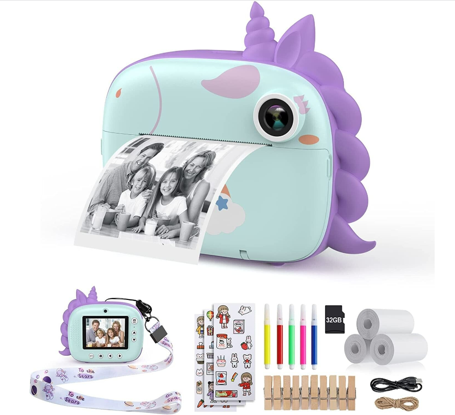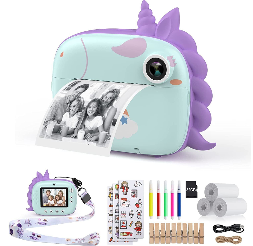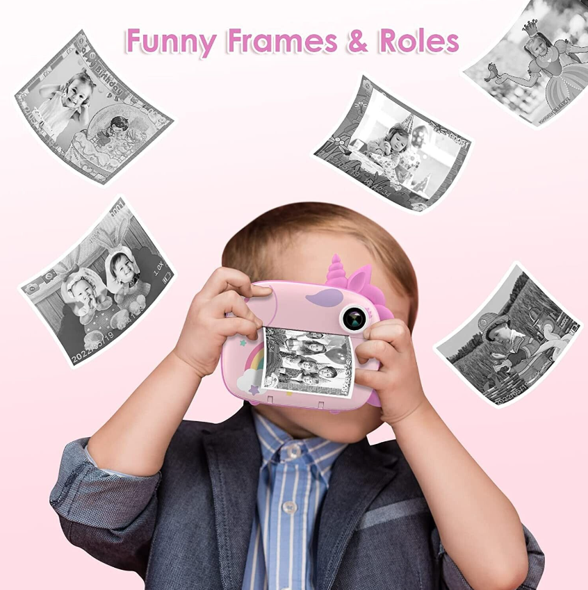 • [ZERO INK INSTANT PRINT CAMERA FOR KIDS] This kids instant camera adopts advanced zero ink technology to print without toner. Kids can instantly freeze and print images on 2.16*3.15inch (5.5*8cm) skin-friendly paper in seconds with a simple press. (3 Rolls Print Paper for up to 150 photos are included in the package)