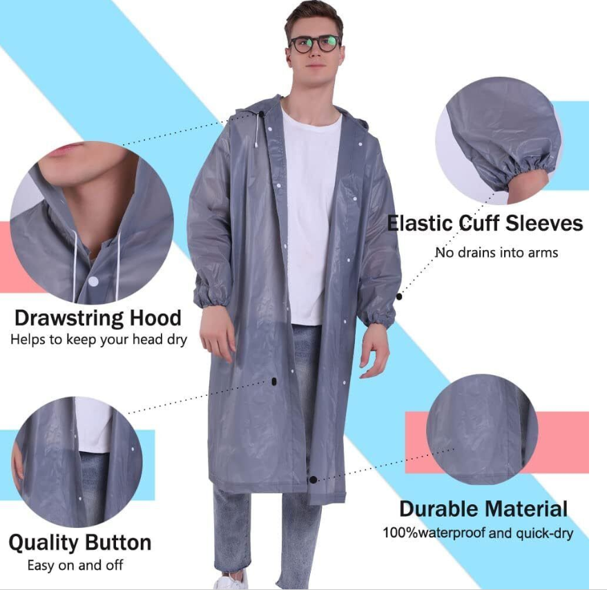 Adults Waterproof Raincoat with Buttons Hooded raincoat with sleeves & elasticated cuffs Lightweight and easy to carry, convenient to wear and re-pack once the rain has stopped Great for emergencies, walking, camping, concert, festivals or other outdoor activities on rainy days Available in: White, , yellow, purple, gray, green, blue, black, orange