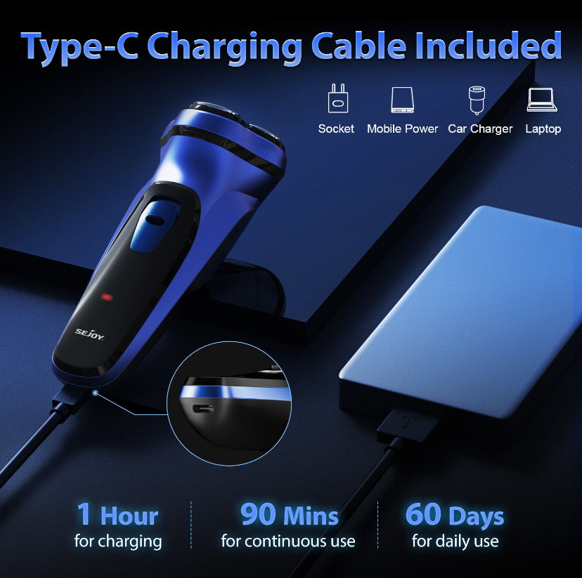 【1 Hour Fast Charging】 - This electric rotary shaver can be used cordless. A full charge takes only 1 hour and last more than 90 minutes ,it can use 60 days .Type-C charging make it convenience to recharge.